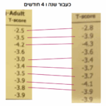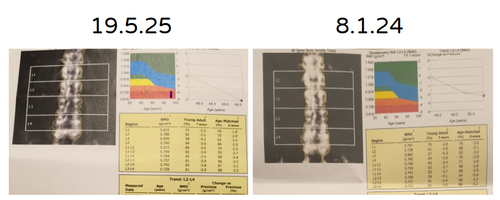 מימין צילום של בדיקות DEXA לפני ההשתתפות בתוכנית ומשמאל התוצאות כעבור שנה ו־4 חודשים של יישום השיטה- בבדיקה משמאל ניתן לראות שכל ערכי ה-T בחוליות עמוד השדרה השתפרו בצורה מובהקת!