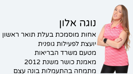 כל התרגילים בטיחותיים גם אם לא מבוצעים “בול”. אם תרגישי לא בנוח, תמיד יש חלופה שמתאימה לך, והעבודה הדרגתית מאפשרת להרגיש בטוחה ולהתקדם בלי סיכון.